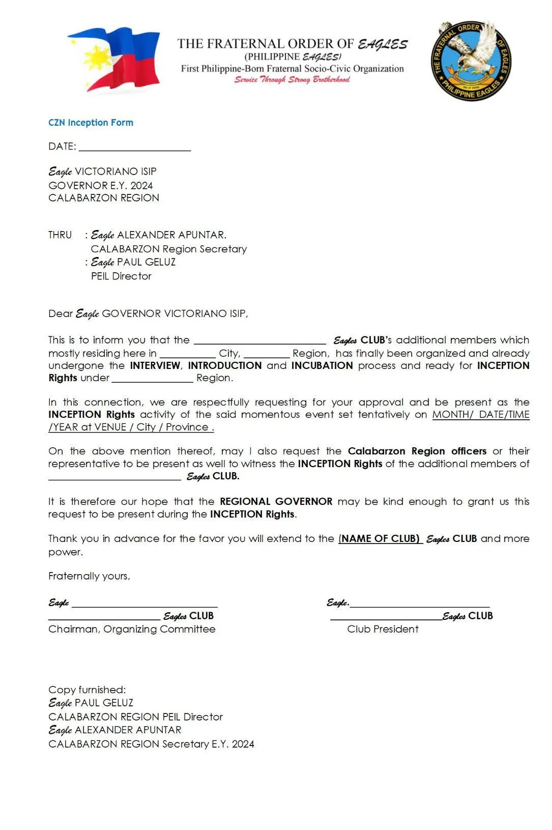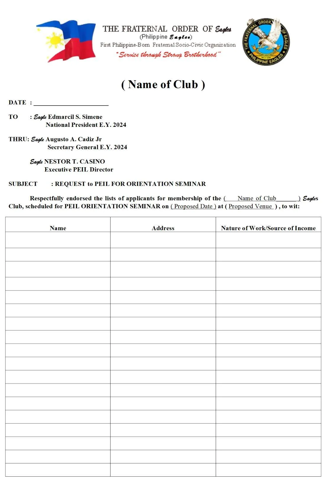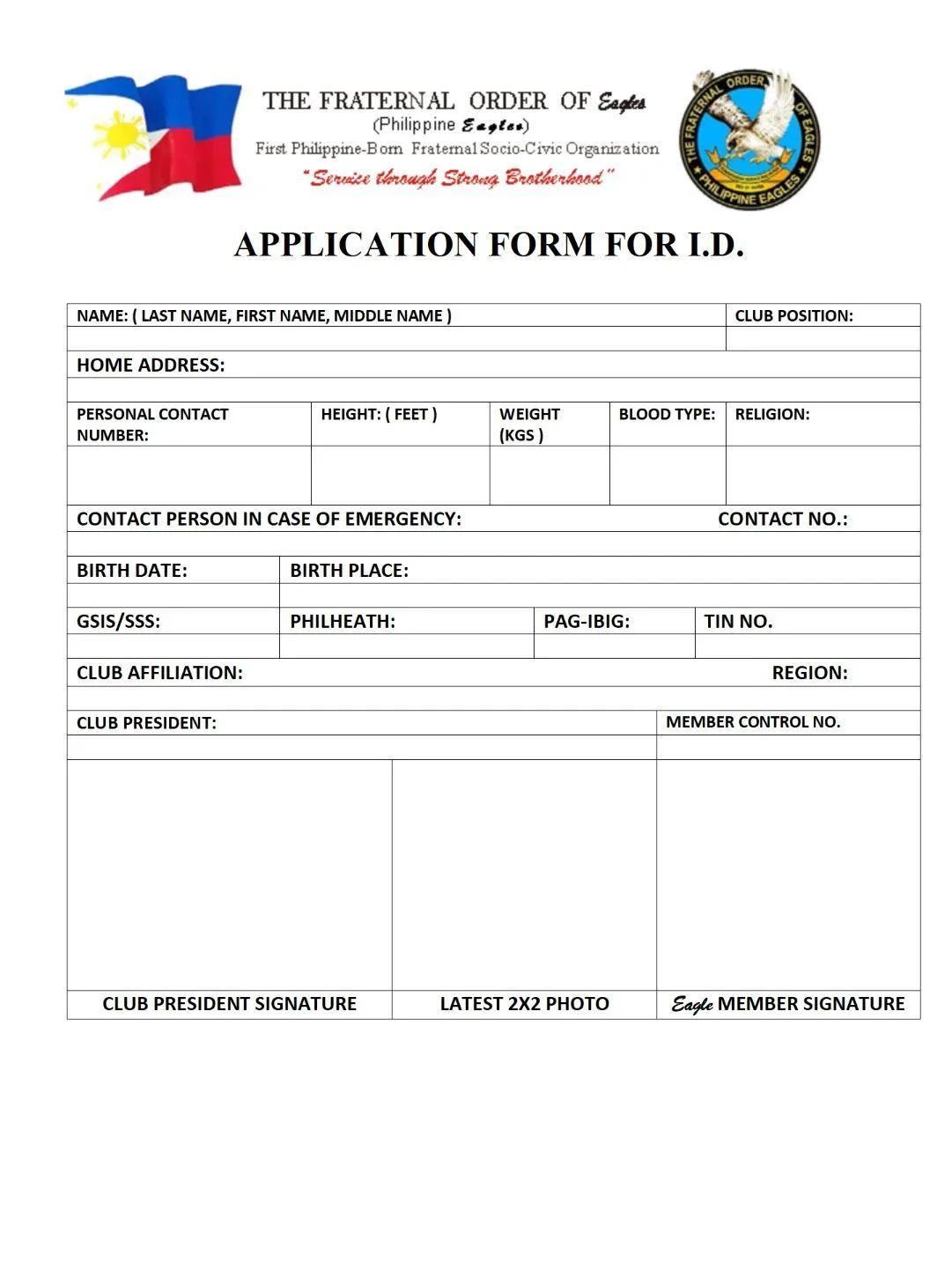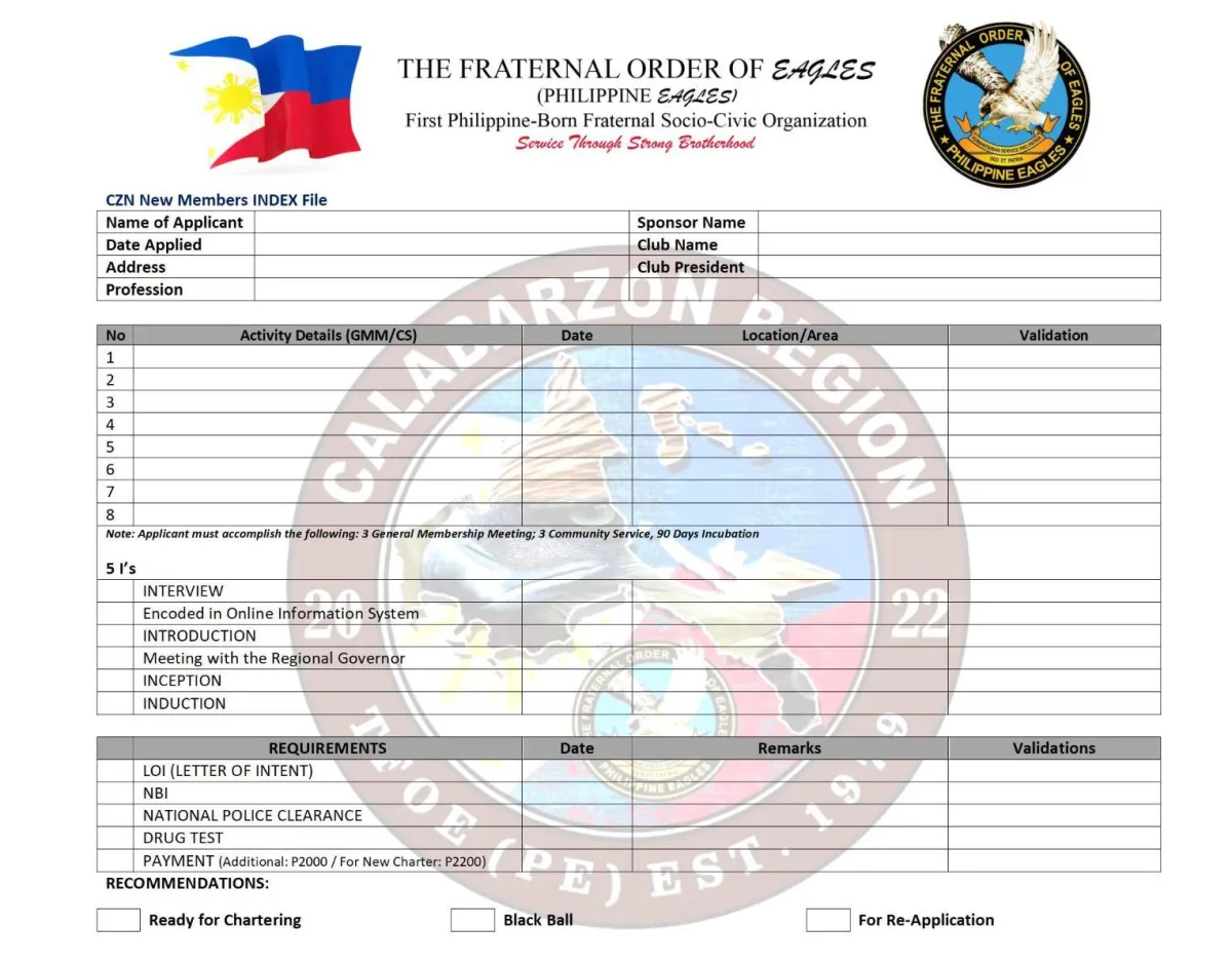 Note: This form is owned and distributed by The Fraternal Order of Eagles (Philippine Eagles). Do not use if you're not part of the organization.