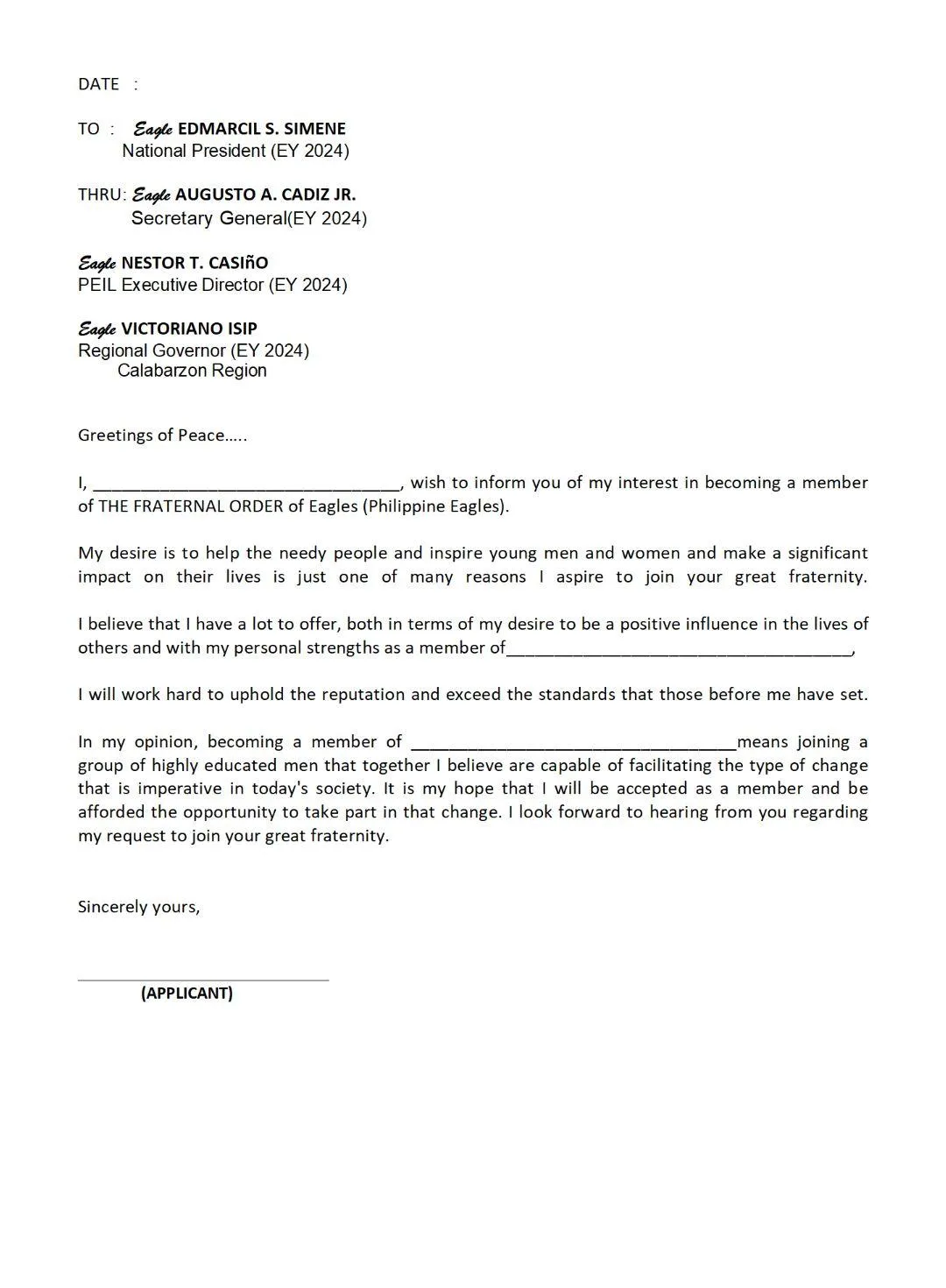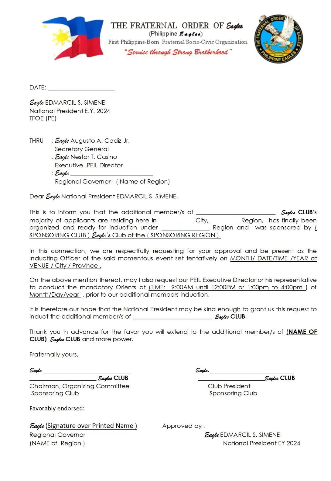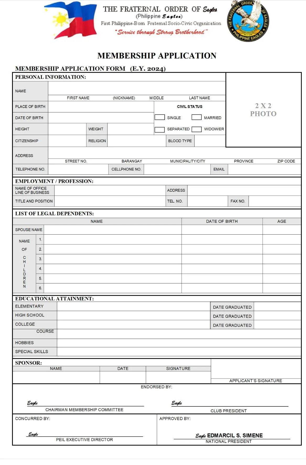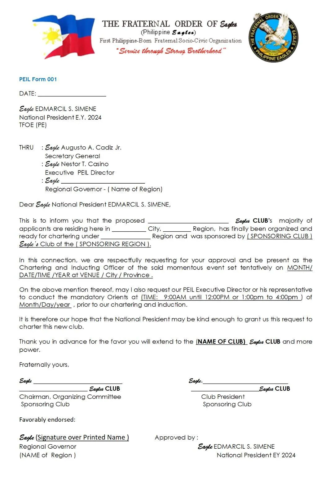 Note: This form is owned and distributed by The Fraternal Order of Eagles (Philippine Eagles). Do not use if you're not part of the organization.